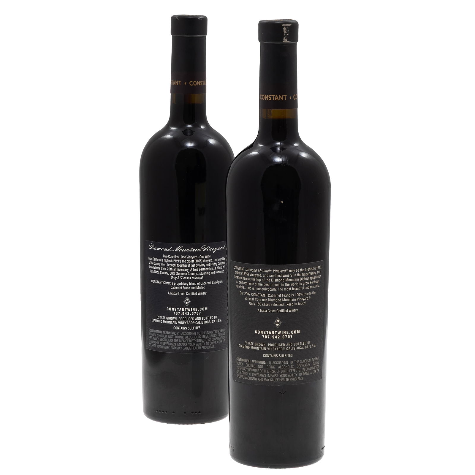 2007 Constant Diamond Mountain Vineyards 2 bottles (75cl) per lot 1 - 2007 Claret Napa and Sonoma County Estates 1 - 2007 Cabernet Franc Napa Valley Estate Condition: No issues noted All wine is sold 'as-is,' with no guarantees regarding provenance, or storage history. In house pick-up or shipping by Buffalo Shippers (707)226-7942; [email protected] only. Restrictions apply. Verify shipping costs and restrictions before bidding.