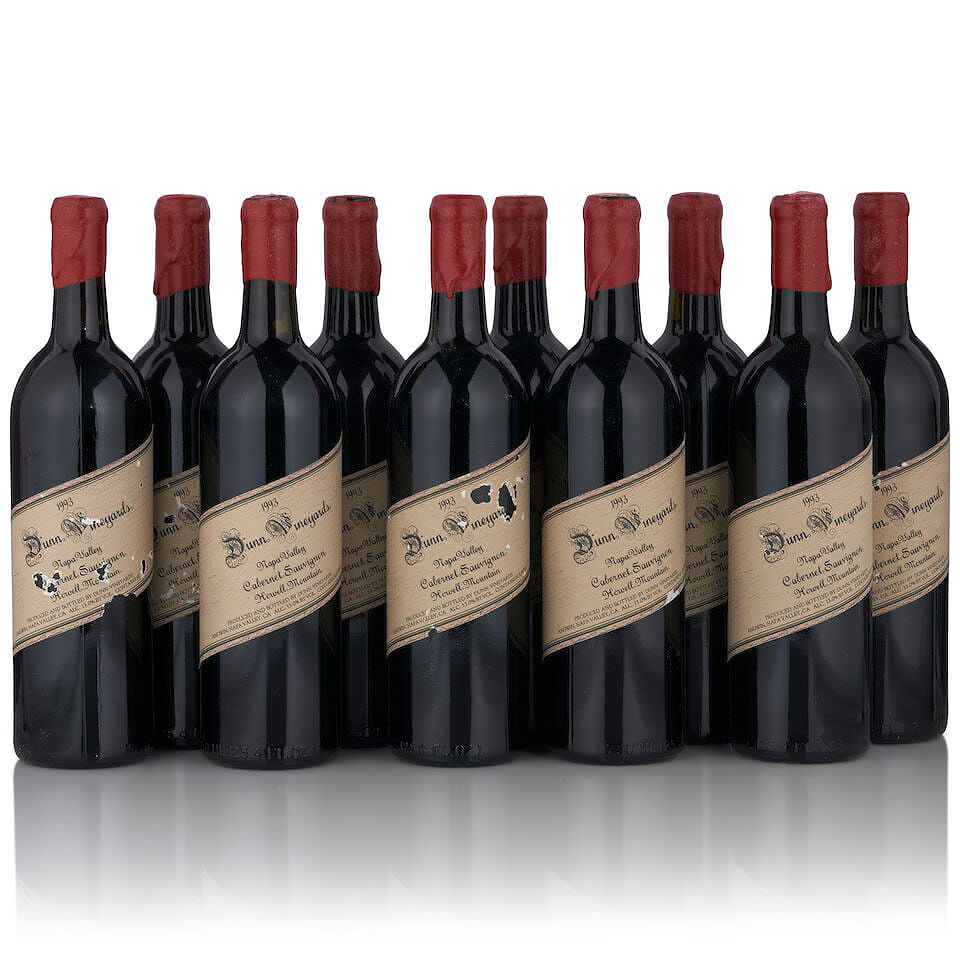 Dunn Howell Mountain, 1993 (10 bottles, 750ml) Region: Napa Valley Fill Level: bottom neck Capsule: lightly bin soiled, one nicked, four heavily chipped with losses Label: one scuffed, two nicked, six more heavily nicked with slight losses Footnotes: California This lot is subject to the following lot symbols: • • Zero rated for tax, no tax will be added to the Hammer Price or the