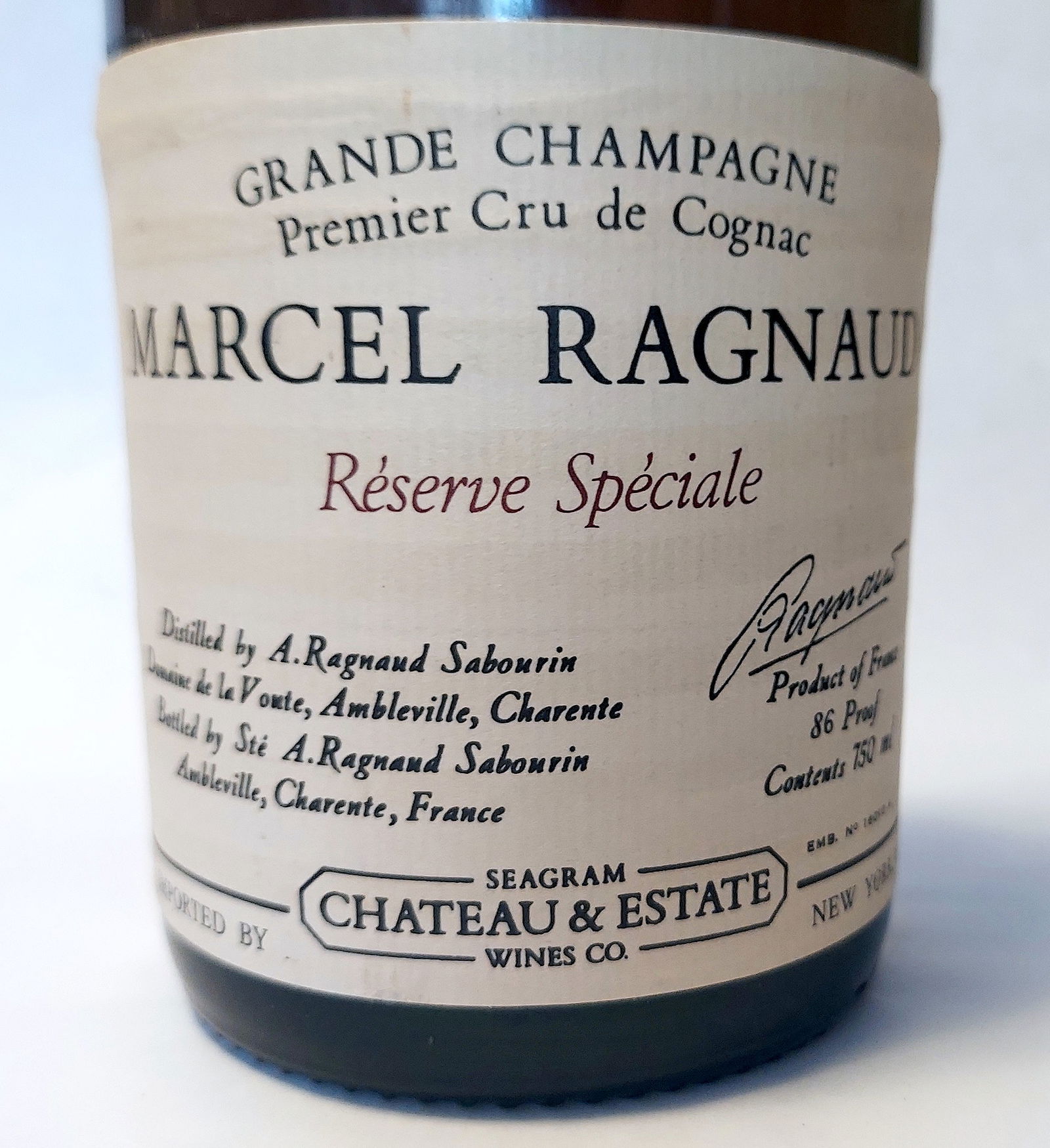 Marcel Ragnaud Réserve Spéciale Cognac, distilled & bottled by A. Ragnaud Sabourin, 43%, 1986 bottling, sealed, 75 cc (750 ml).