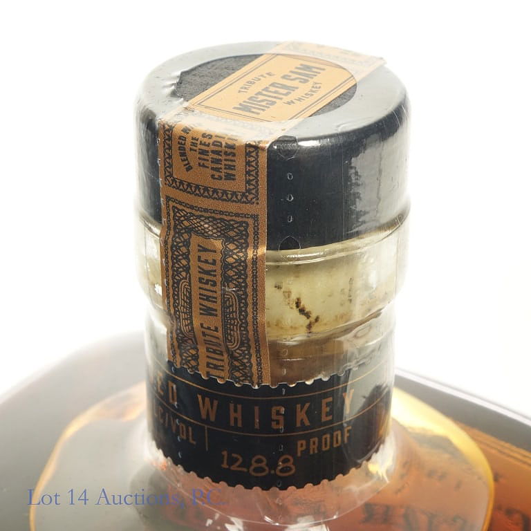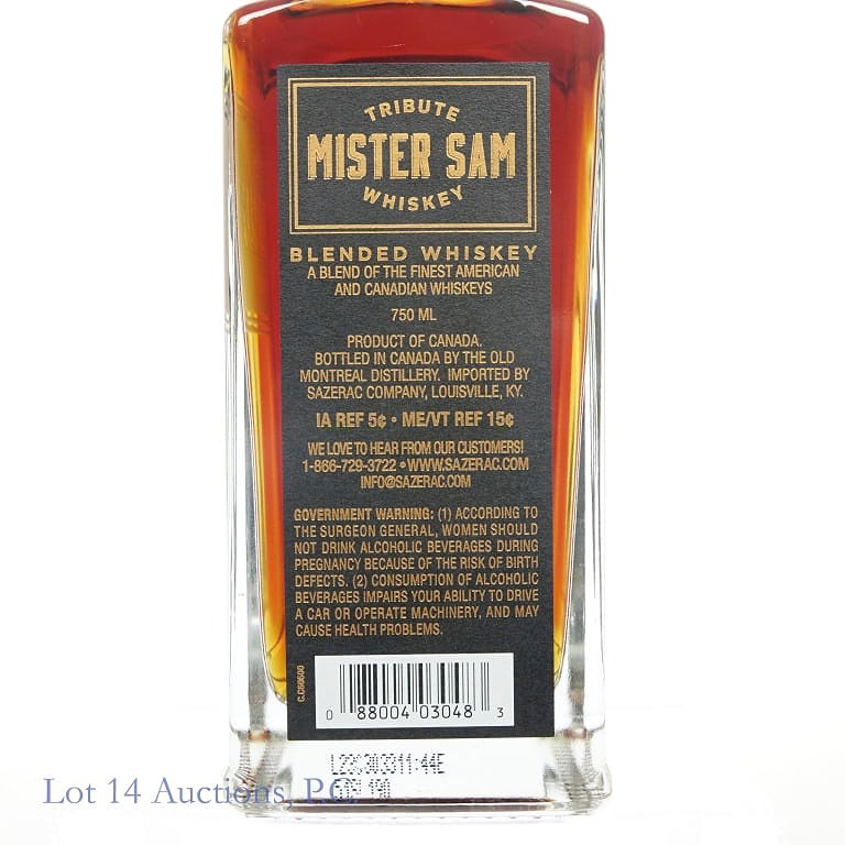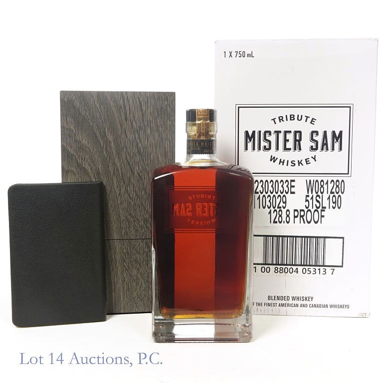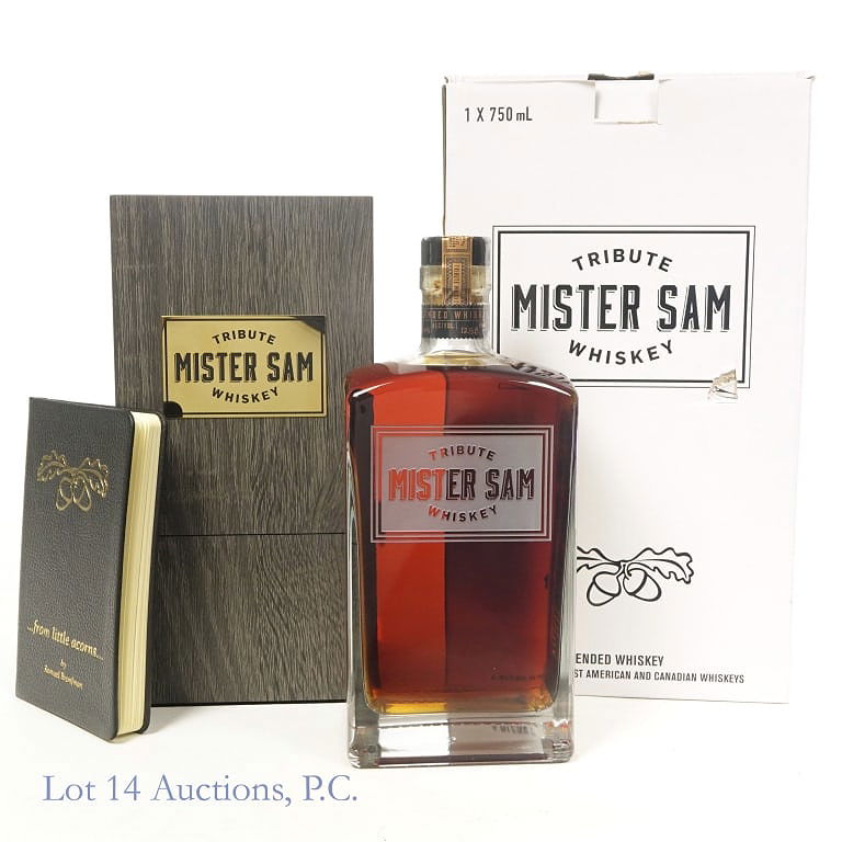 Mister Sam Tribute Blended Whiskey (2023), 128.8 Proof, 750 ml. Wooden case included in very good condition. "...from little acorns..." Booklet by Samuel Bronfman included. Original cardboard packaging also included. Etch on bottle: L23(9)303311:44E