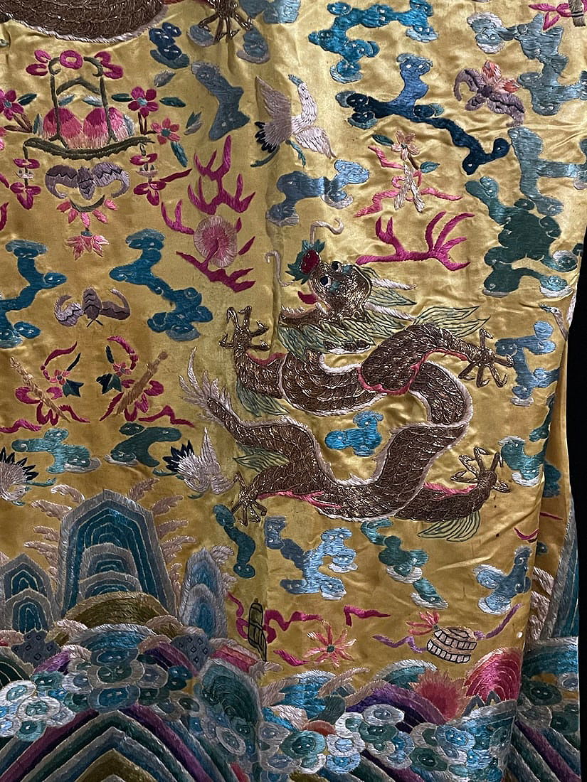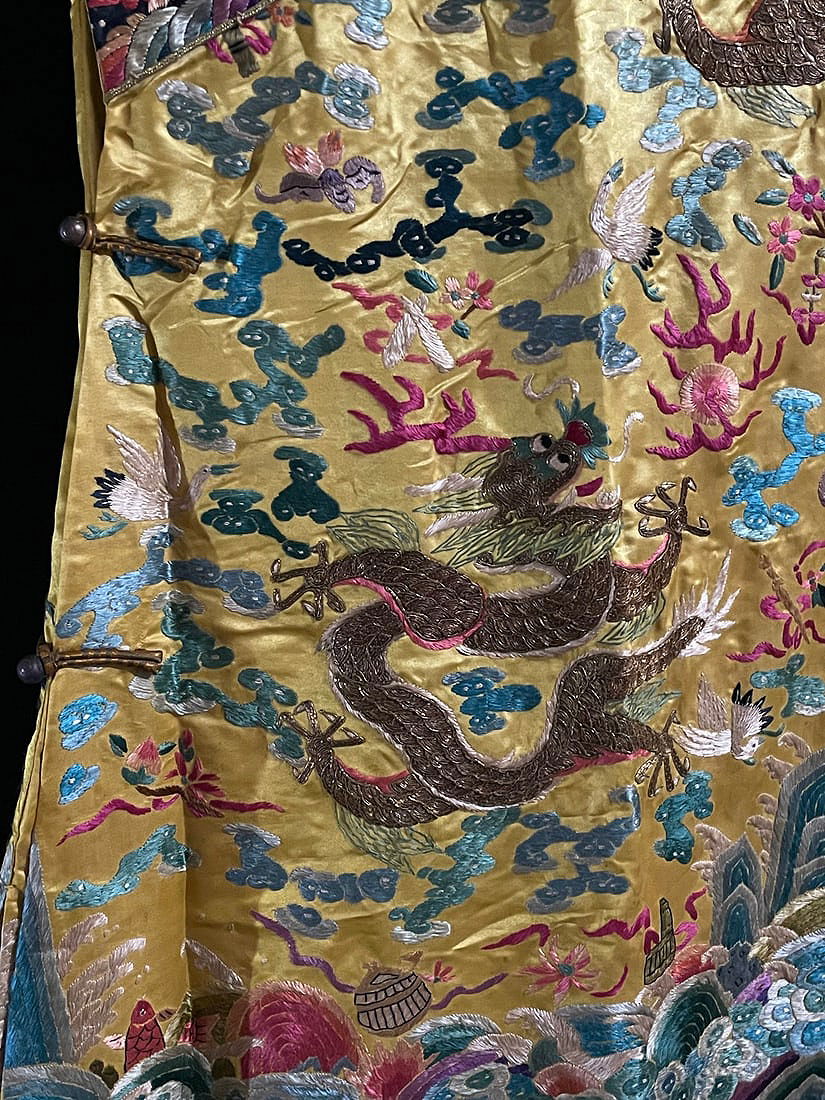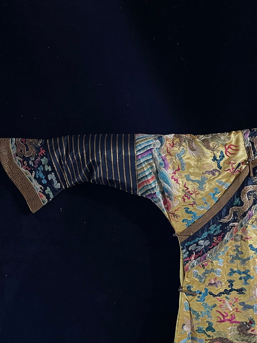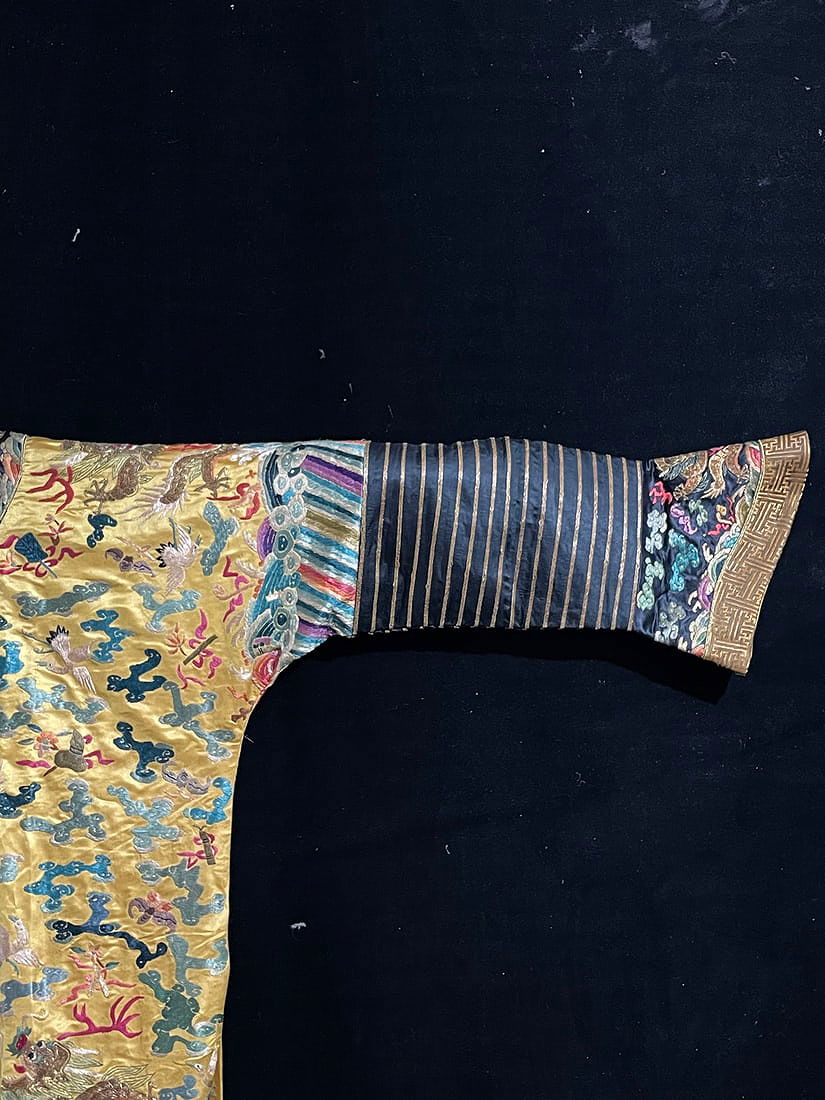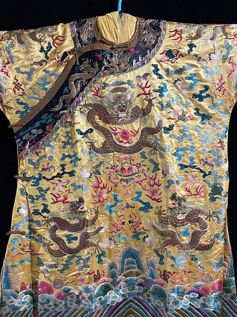 Antique Embroidered Dragon Robe with Collar Buttons and Silk Brocade, featuring hand-embroidered colored clouds and golden dragons, dragon patterns in gold thread, accented with two dragons playing with a pearl amidst auspicious clouds, and a pattern of waves and cliffs at the hem. The robe measures 137 cm in length, 185 cm in sleeve length, 72 cm in chest circumference, and 104 cm in hem width. The gold thread embroidery is in excellent condition, making this an exceptional piece of old embroidery.