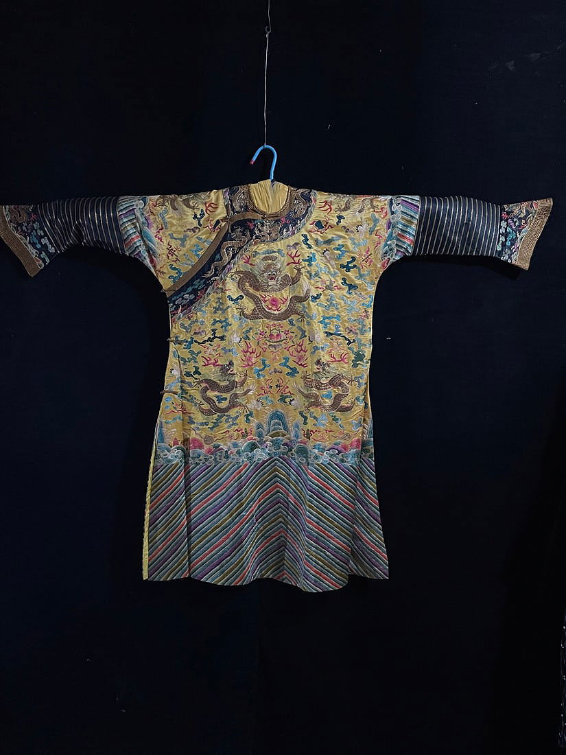 Qing Dynasty Embroidered Dragon Robe, Round Neck with Disc Buttons, Tribute Satin Dragon Robe