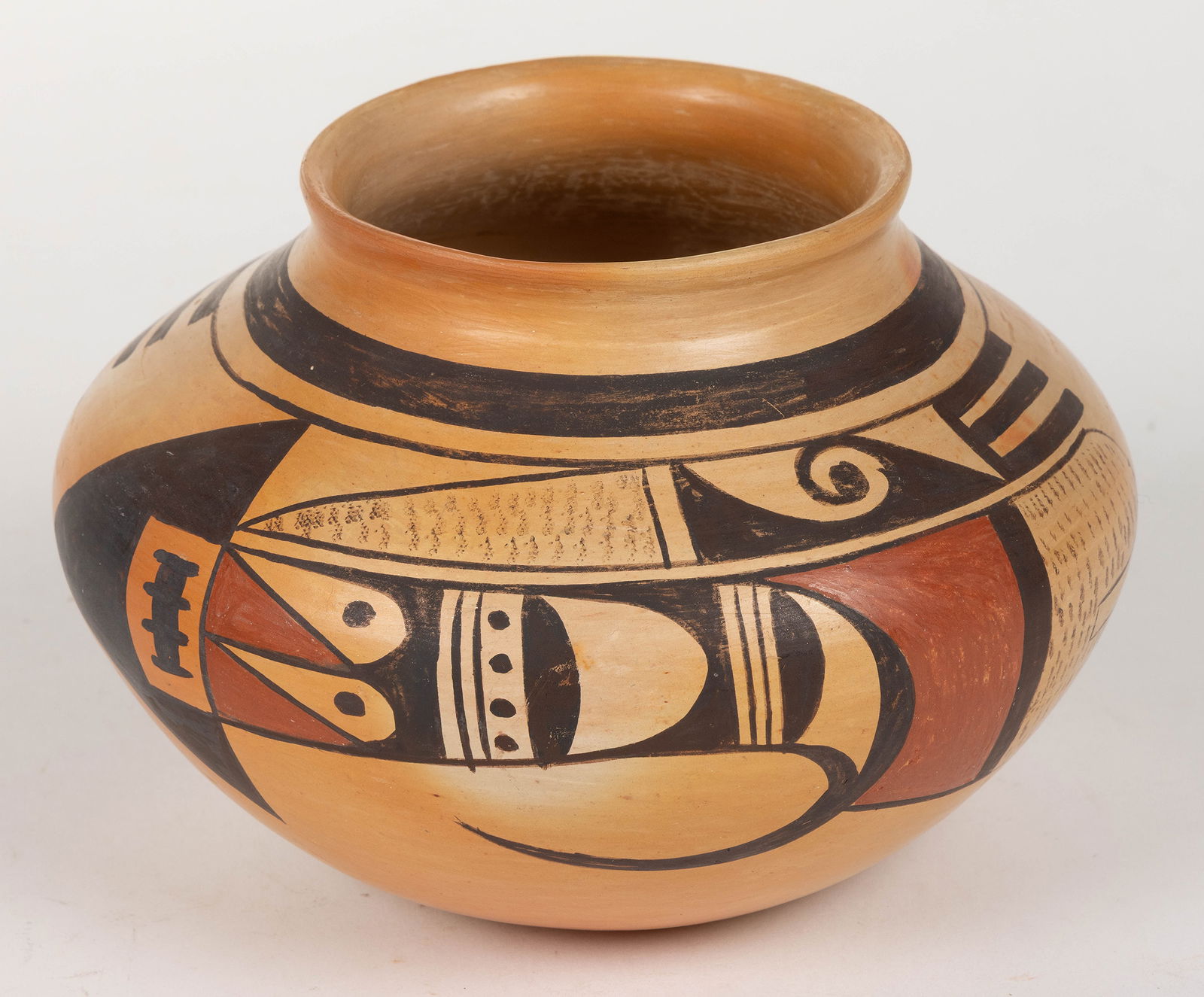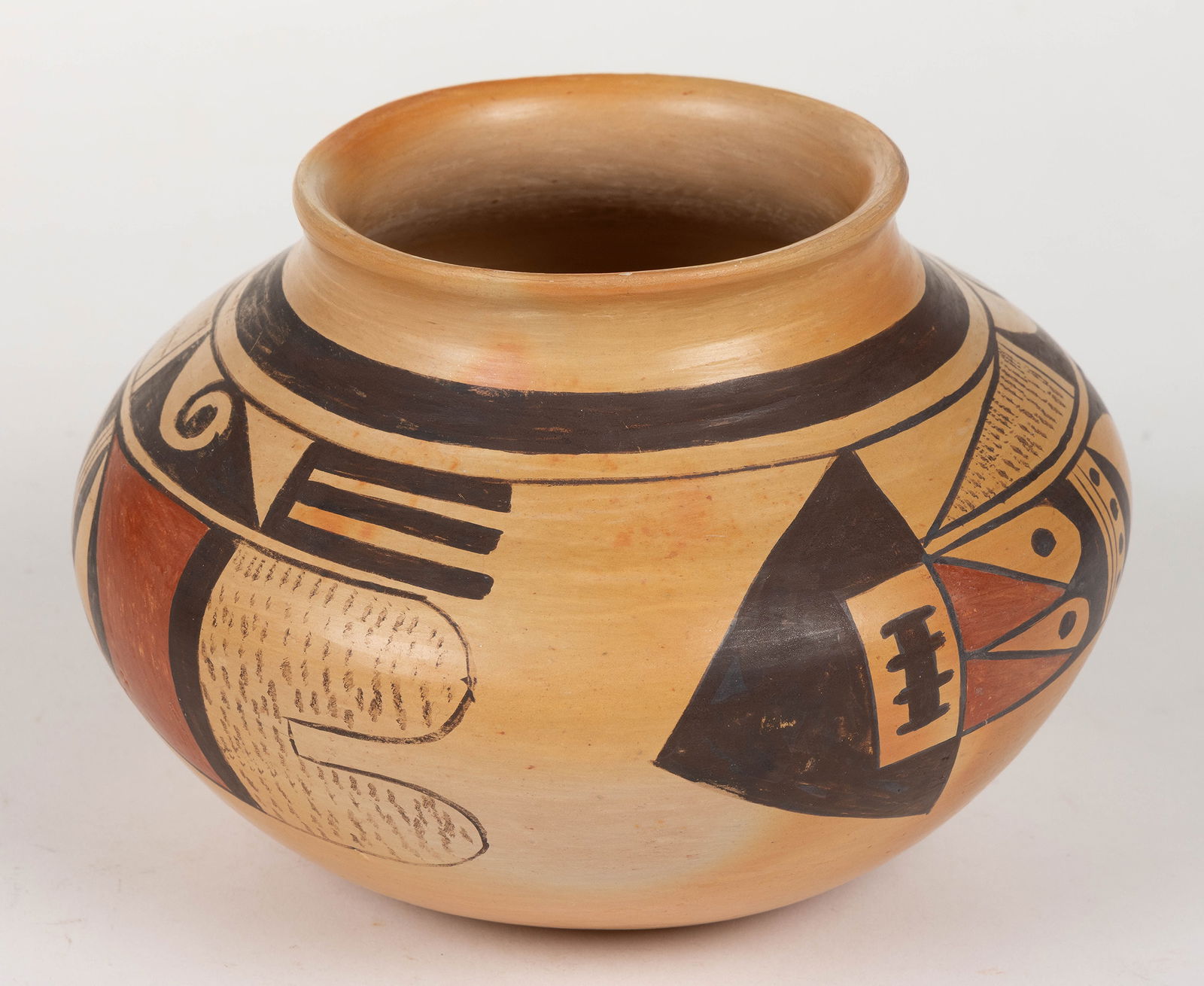 SIGNED FANNIE NAMPEYO (1900-1987) NATIVE AMERICAN HOPI-TEWA POTTERY ARTICLES, LOT OF TWO, each having polychrome hand-painted geometric designs, comprising a cruciform dish and a jar with arrow and feather design, each signed to underside. Mid 20th century. Jar 4 3/8" H.