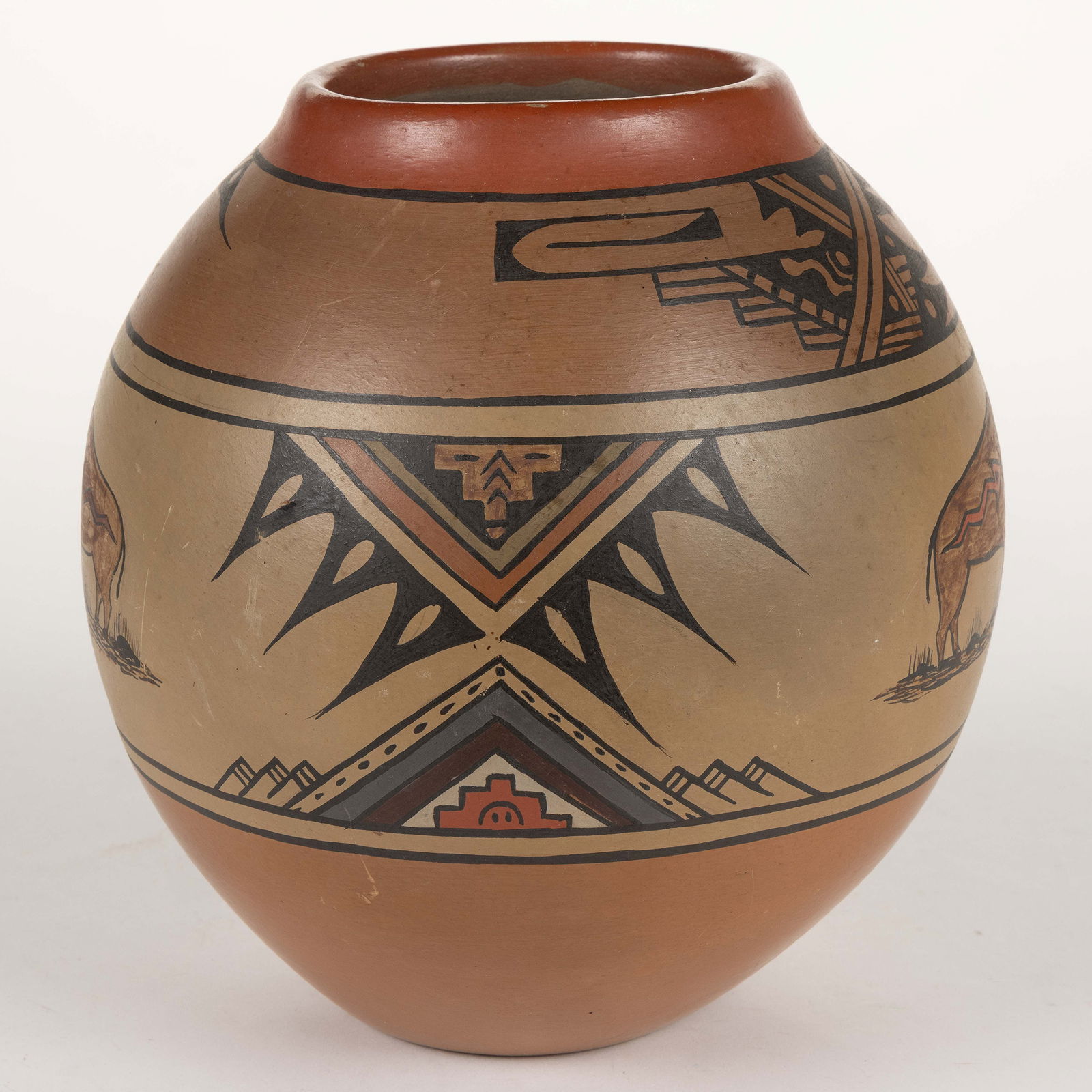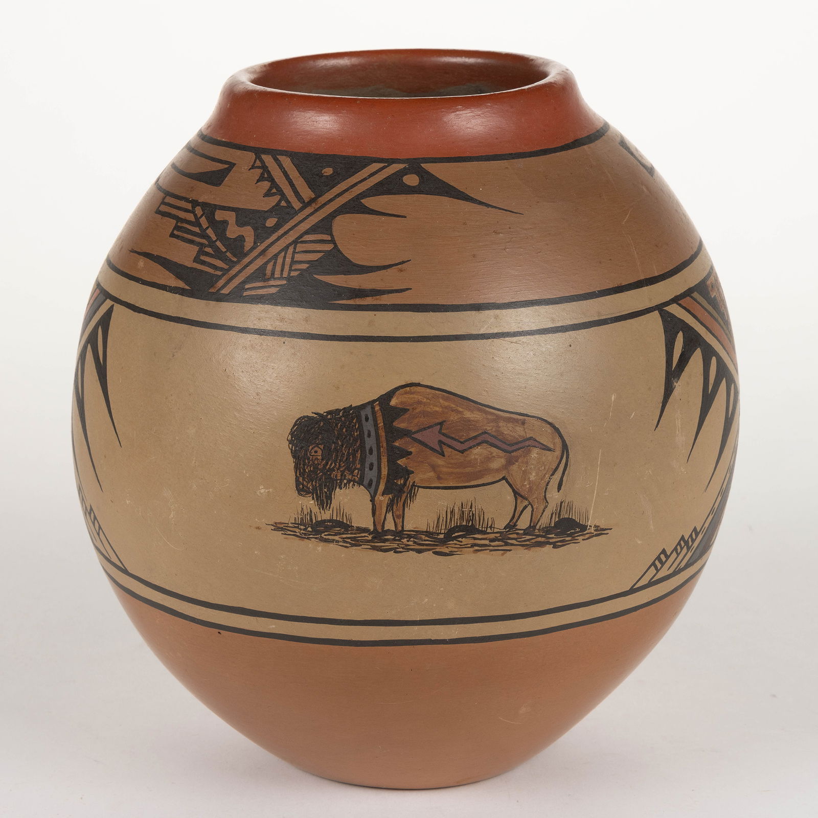 SIGNED LELA GUTIERREZ (1895-1966) AND VAN GUTIERREZ (1870-1956) NATIVE AMERICAN SANTA CLARA PUEBLO POTTERY VASE, polychrome decoration featuring bison, signed to underside. First half 20th century. 8 1/8" H.